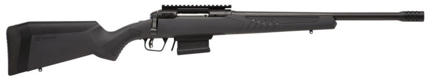 Savage\’s 110 Haymaker model offers precision and pwer for the deer, bear, and hog hunter. It features Savage\’s AccuFit synthetic stock with five comb riser sizes for the perfect cheek-to-stock weld, four composite inserts to establish your unique length-of-pull, and AccuStock. The AccuStock consists of a rigid rail system firmly embedded in the stock throughout the foreend of the rifle. It also engages the action three dimensionally along its entire length. The 110 Wolverine also features AccuTrigger for flexibility, a button-rifled carbon steel barrel with a ported muzzle break, 20 MOA mounted rail, soft grip fore-end and pistol grip, and a Magpul AICS-style detachable box magazine. This 450 Bushmaster model has a 18\” matte black barrel with 11/16×26 threads and a gray finish stock.